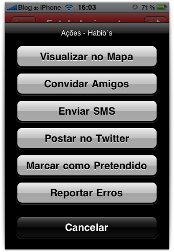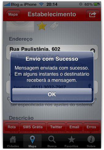 Outra ótima novidade é que você pode enviar SMS gratuitos para amigos ou familiares, com a localização do restaurante ou bar onde você está. Tudo isso sem sair do aplicativo. Sensacional!