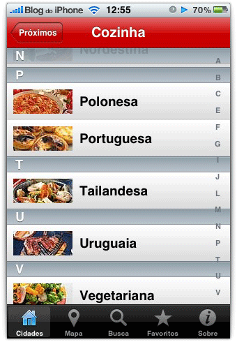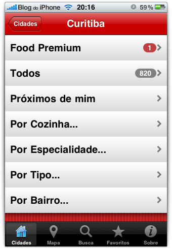 Cada cidade apresenta várias opções de busca, como tipo de cozinha, especialidades, por bairro e até por proximidade, baseado na geolocalização.