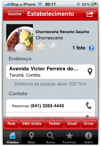 Ao selecionar um restaurante, você obtém a ficha completa com endereço, telefone, apresentação, horários de abertura, formas de pagamento e até fotos. Com um simples toque na tela é possível ligar diretamente para o estabelecimento para fazer sua reserva ou pedir alguma informação. É possível também enviar um email diretamente do aplicativo.