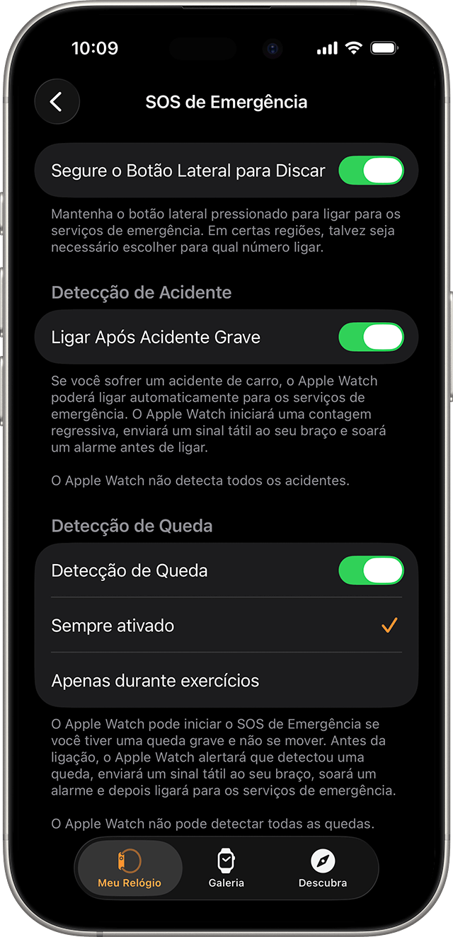 - Ative ou desative a opção Detecção de Queda. Se a Detecção de Queda estiver ativada, você poderá selecionar Sempre ativado ou Apenas durante exercícios.