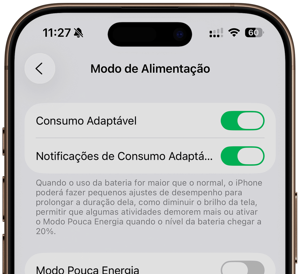 A Apple afirma que, dependendo do uso, o Consumo Adaptável pode ativar automaticamente o Modo de Pouca Energia quando a bateria atingir 20%, evitando que o usuário seja pego de surpresa.