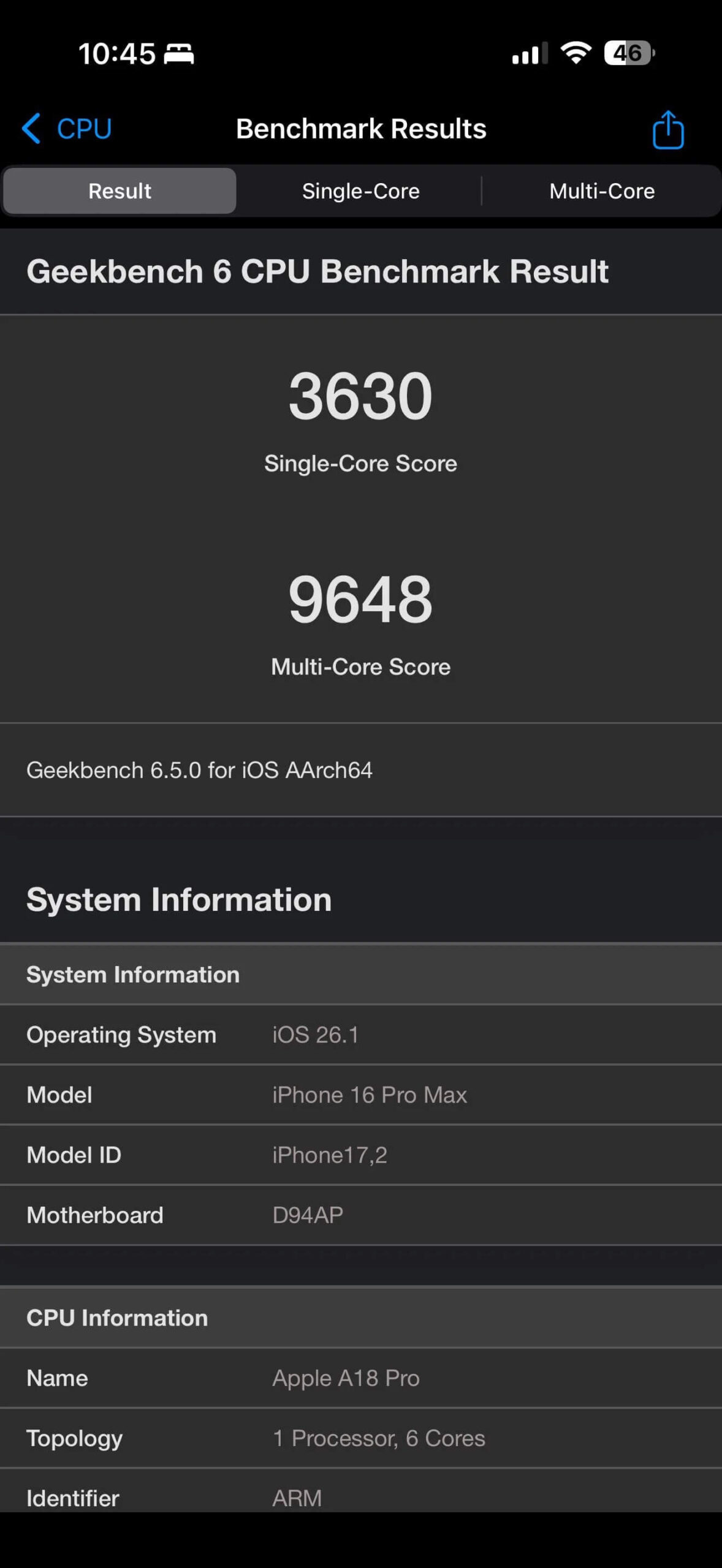 O iPhone 16 Pro Max, com o A18 Pro e refrigeração ativa, marcou 3.630 pontos em single-core e 9.638 em multi-core.