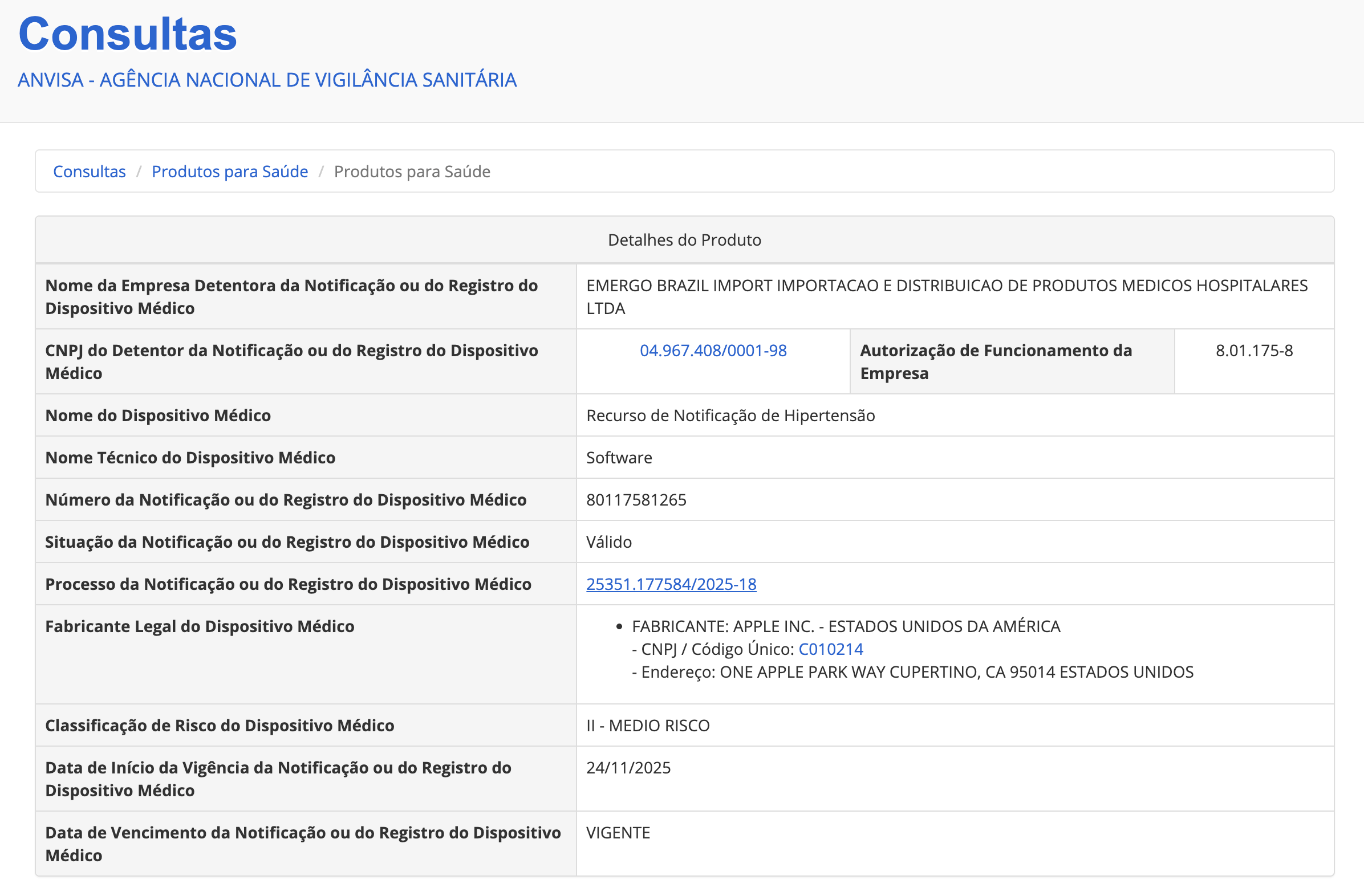 A empresa responsável pelo registro no Brasil é a Emergo Brazil Importação e Distribuição de Produtos Médicos Hospitalares Ltda, que representa oficialmente a Apple em processos de certificação sanitária.