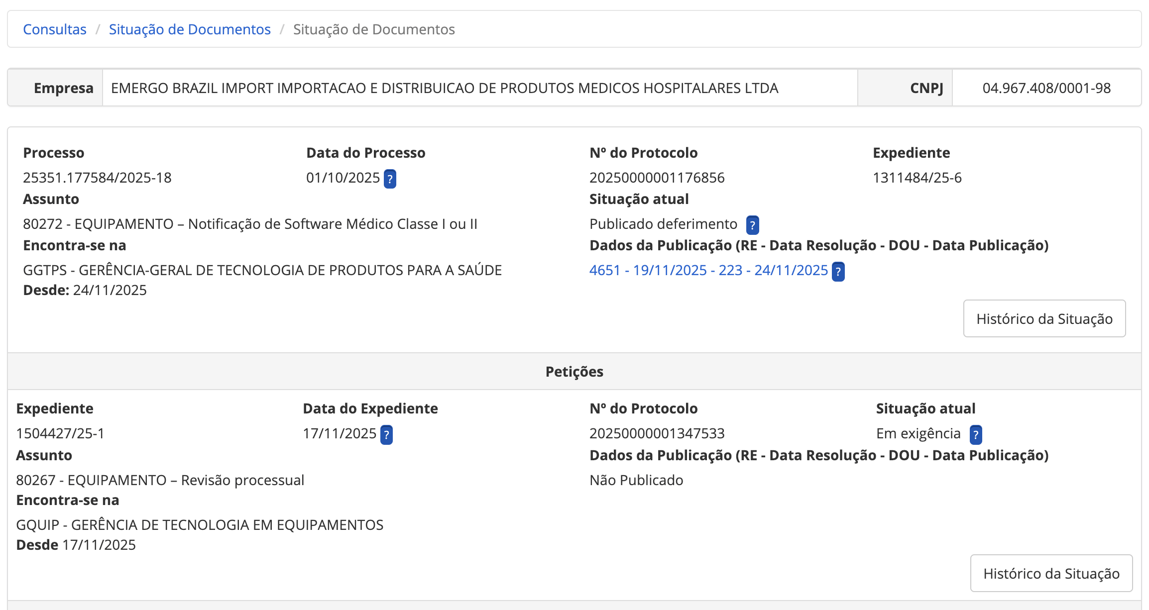 Com a publicação do deferimento, o dispositivo agora consta como “Válido” no banco de dados oficial da Anvisa.
