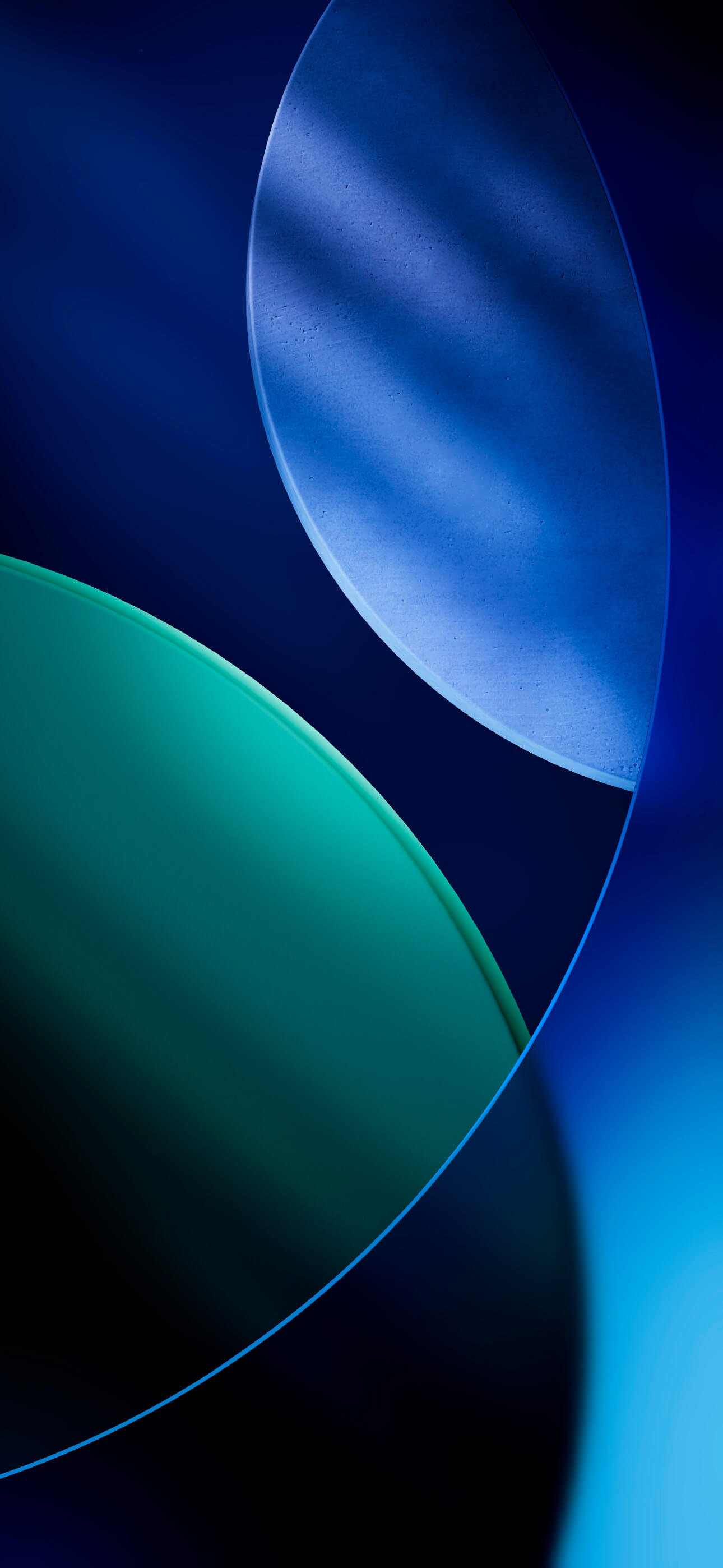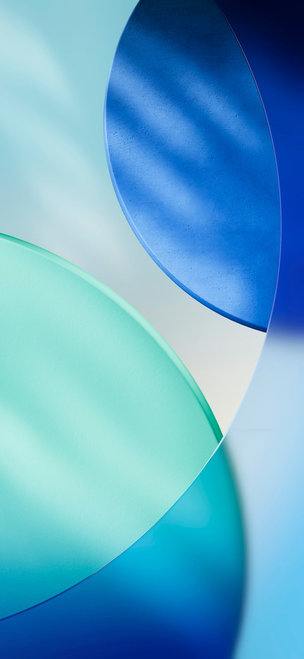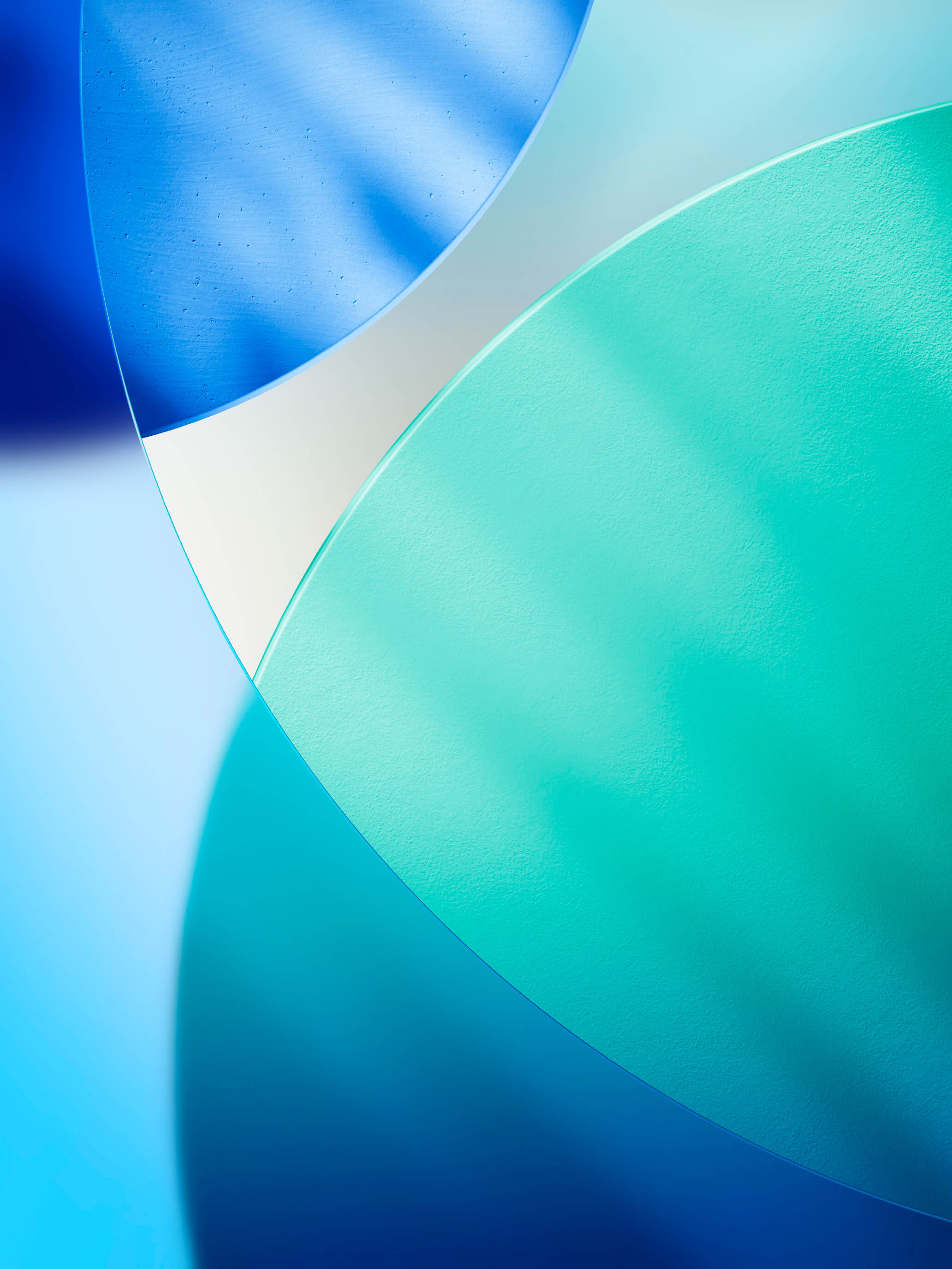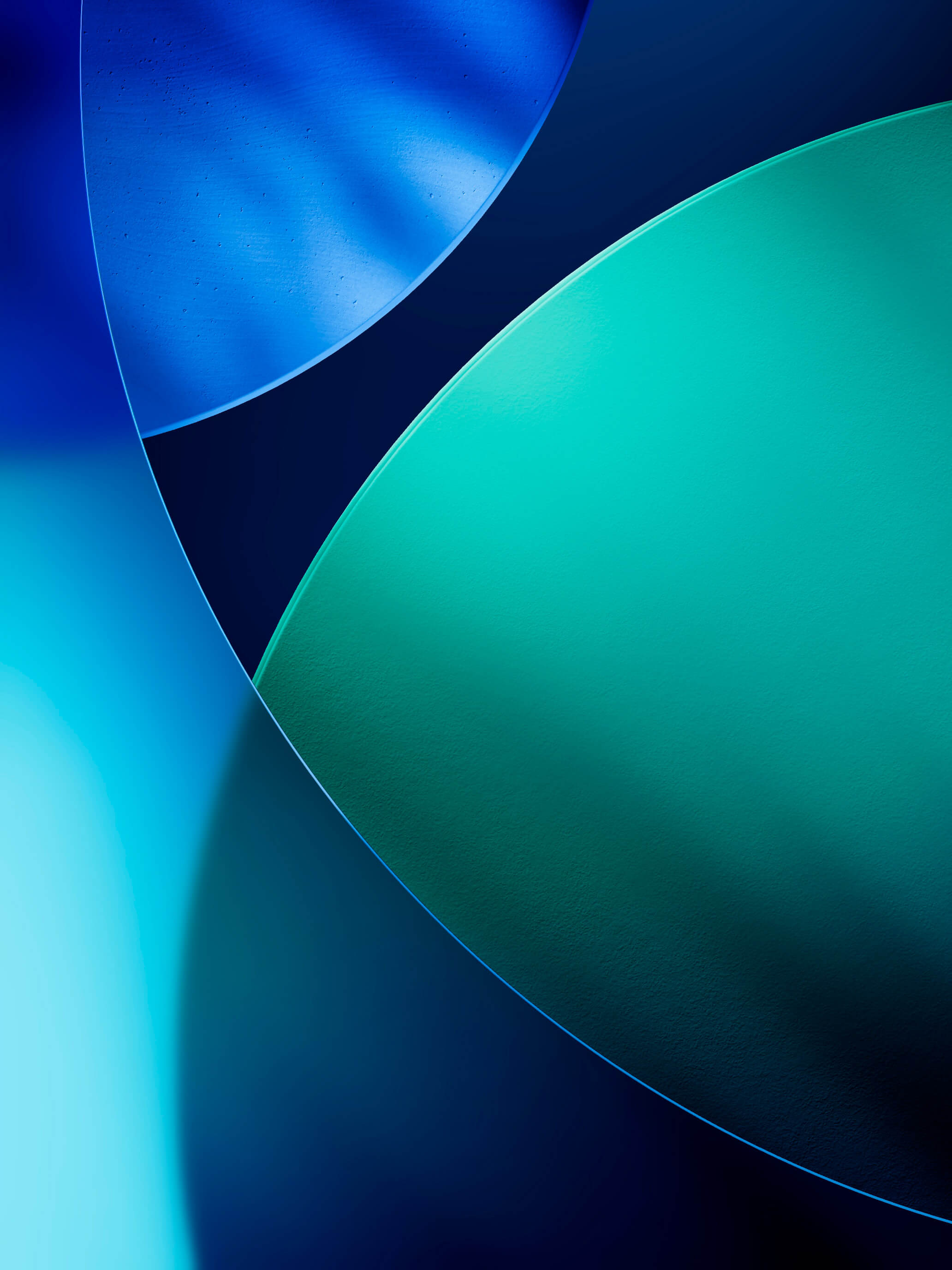 A imagem apresenta formas abstratas que se sobrepõem em tons de azul cobalto e verde-água vibrante, com textura que lembra vidro fosco e sombras sutis que criam um leve efeito 3D.